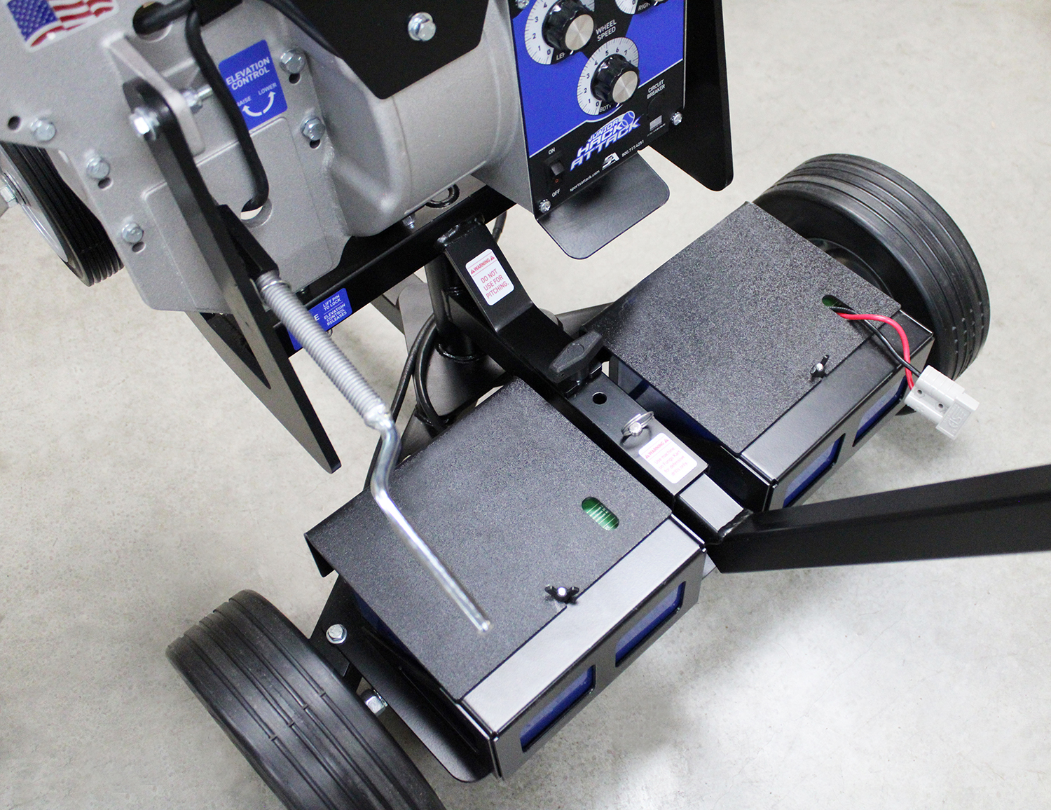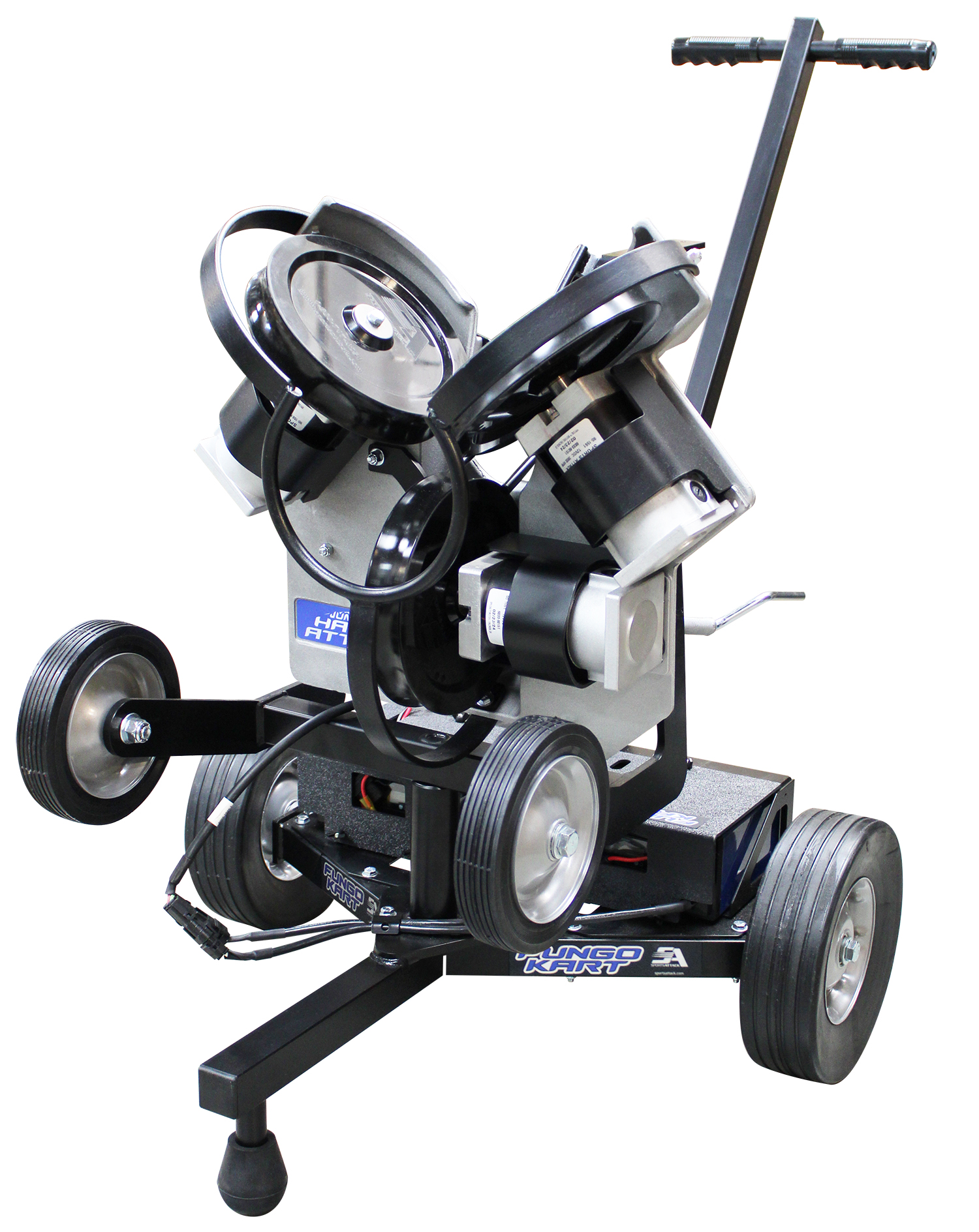 The New Sports Attack Junior Fungo Kart Combo Machine (DC Model) provides a realistic release point for all fungo work. This extremely portable combo quickly maneuvers around the infield using solid, heavy-duty transport wheels. The swivel design on the Junior Hack Attack allows 360 degree movement to easily simulate fly balls, grounders and catcher pop ups. Powder-coated steel construction will withstand the outdoor elements. On the battery unit, the two, 12V Lithium, long-life batteries reside in a rubber-padded battery box that protects them from impact and vibration and has LED Power Displays. The DC unit provides continual use for extended practice sessions.