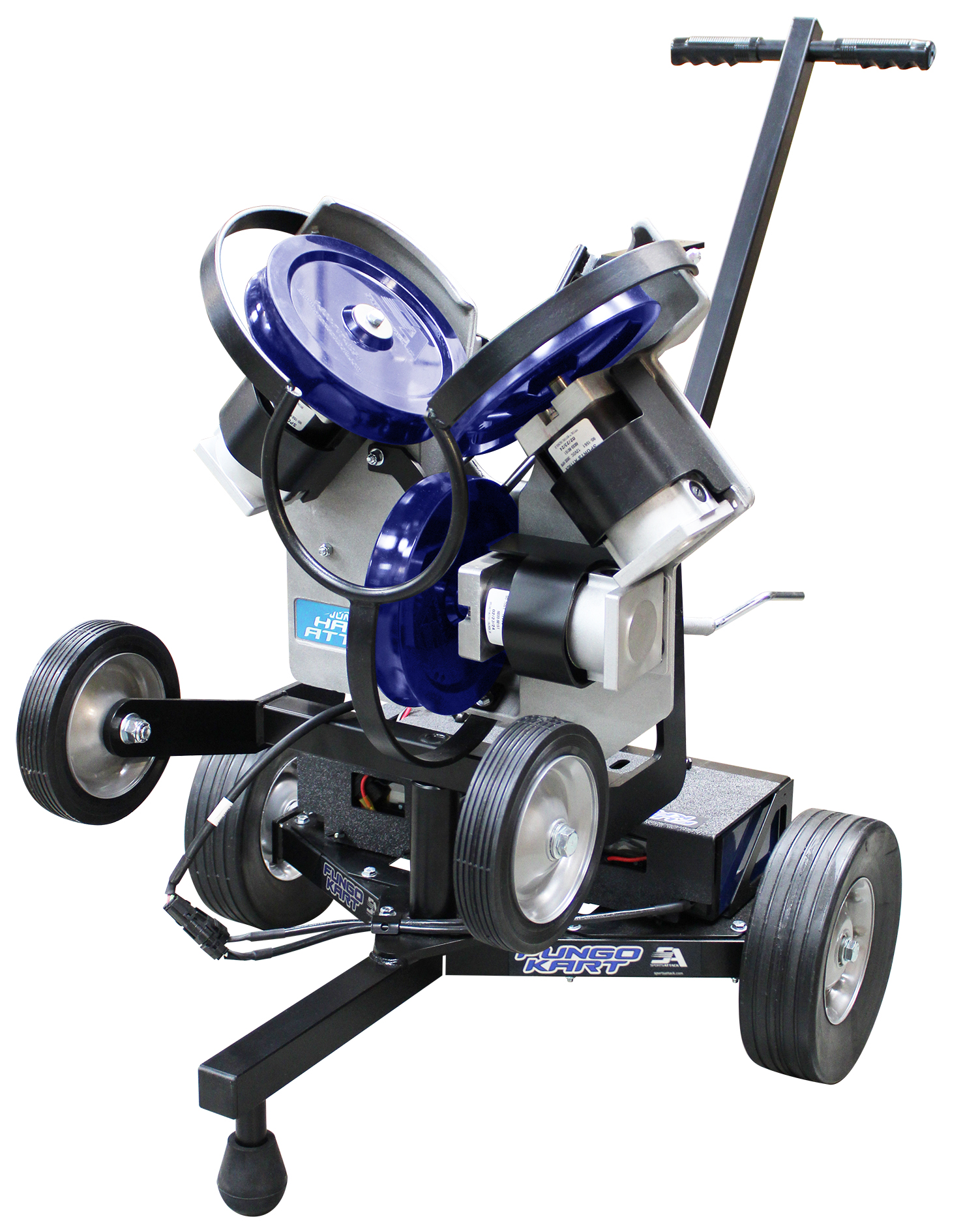 The New Sports Attack Junior Fungo Kart Softball Combo Machine (DC Model) provides a realistic release point for all fungo work. This extremely portable combo quickly maneuvers around the infield using solid, heavy-duty transport wheels. The swivel design on the Junior Hack Attack allows 360 degree movement to easily simulate fly balls, grounders and catcher pop ups. Powder-coated steel construction will withstand the outdoor elements. On the battery unit, the two, 12V Lithium, long-life batteries reside in a rubber-padded battery box that protects them from impact and vibration and has LED Power Displays. The DC unit provides continual use for extended practice sessions.